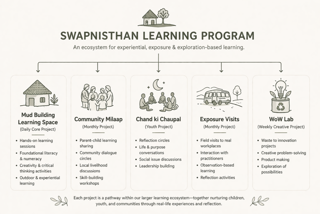 To break this cycle, there is an urgent need to create an innovative learning environment that focuses on wholistic development of underprivileged children. Thus, Swapnisthan offers an open learning environment where education extends beyond the classroom, integrating the natural surroundings and local community into the learning process.